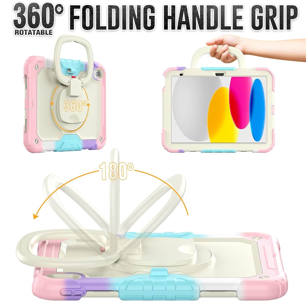 Incluye un soporte trasero ajustable que permite colocar el iPad en distintas posiciones para ver videos, estudiar o jugar cómodamente. Además, cuenta con un asa giratoria de 360°, perfecta para transportarlo fácilmente y para usarlo como soporte en orientación horizontal o vertical.