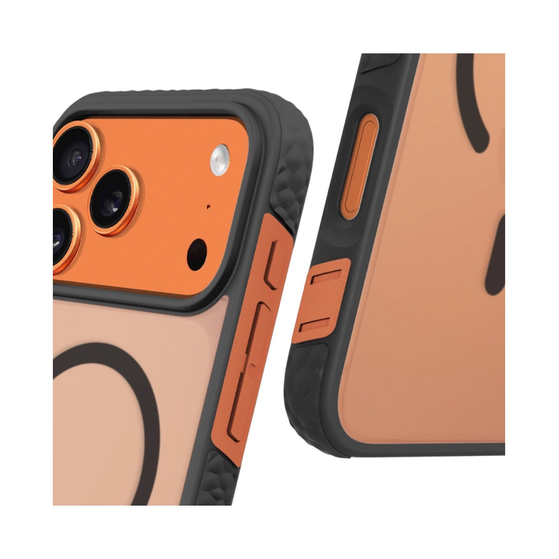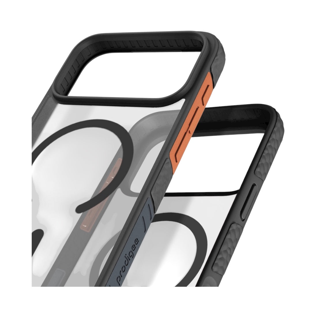 El Case Prodigee Jogger Midnight está diseñado para quienes buscan protección robusta con un estilo deportivo y moderno. Su estructura combina un marco reforzado en color negro con detalles en tono naranja mate, creando un contraste atractivo que resalta tu iPhone.