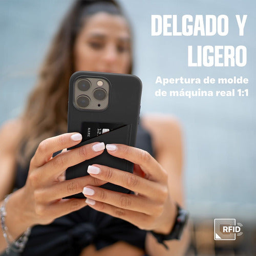 Este modelo incorpora un práctico compartimento trasero que permite guardar tarjetas esenciales como identificaciones o tarjetas bancarias, facilitando la movilidad sin necesidad de llevar cartera. Su diseño ajustado garantiza un acceso cómodo a todos los botones, puertos y funciones del dispositivo.