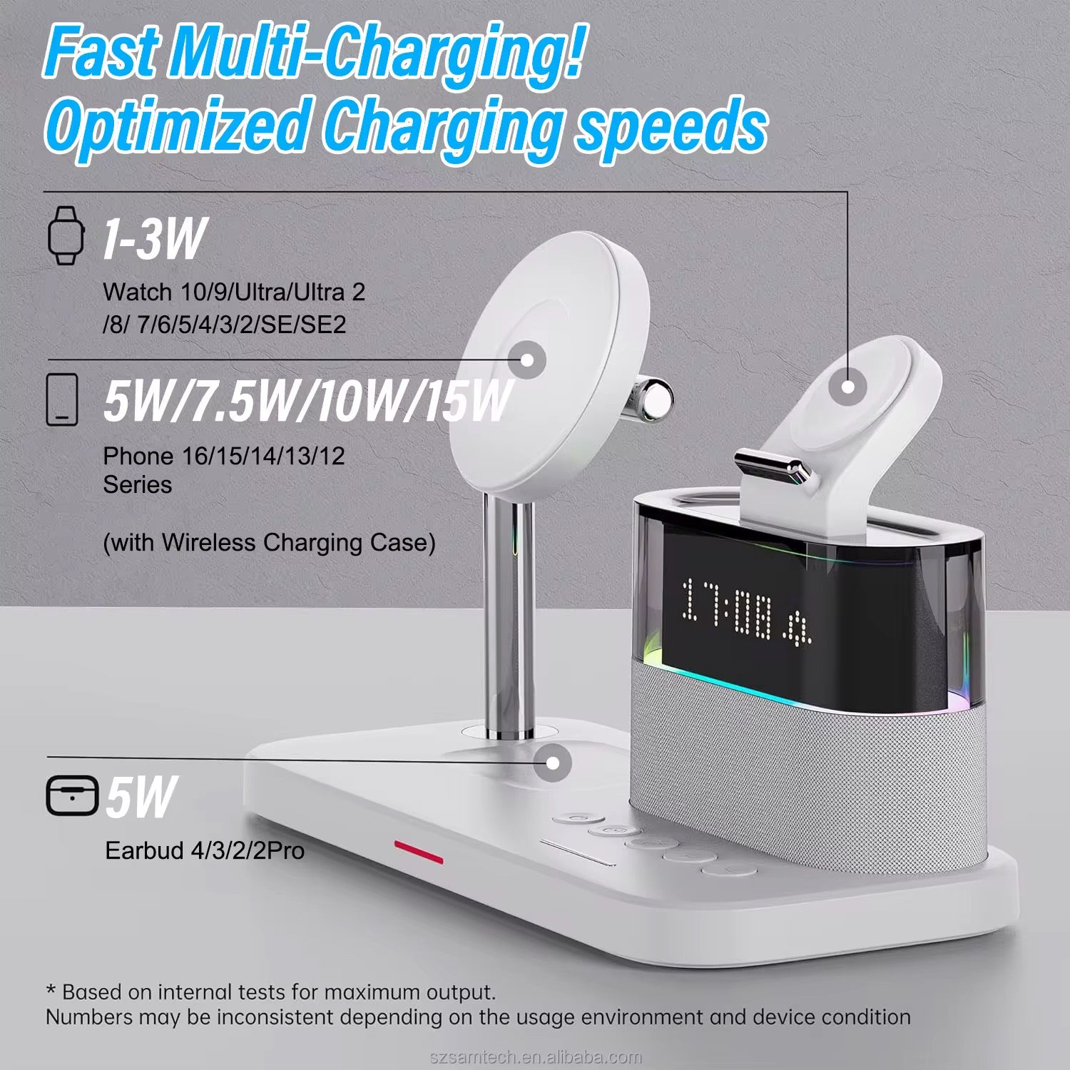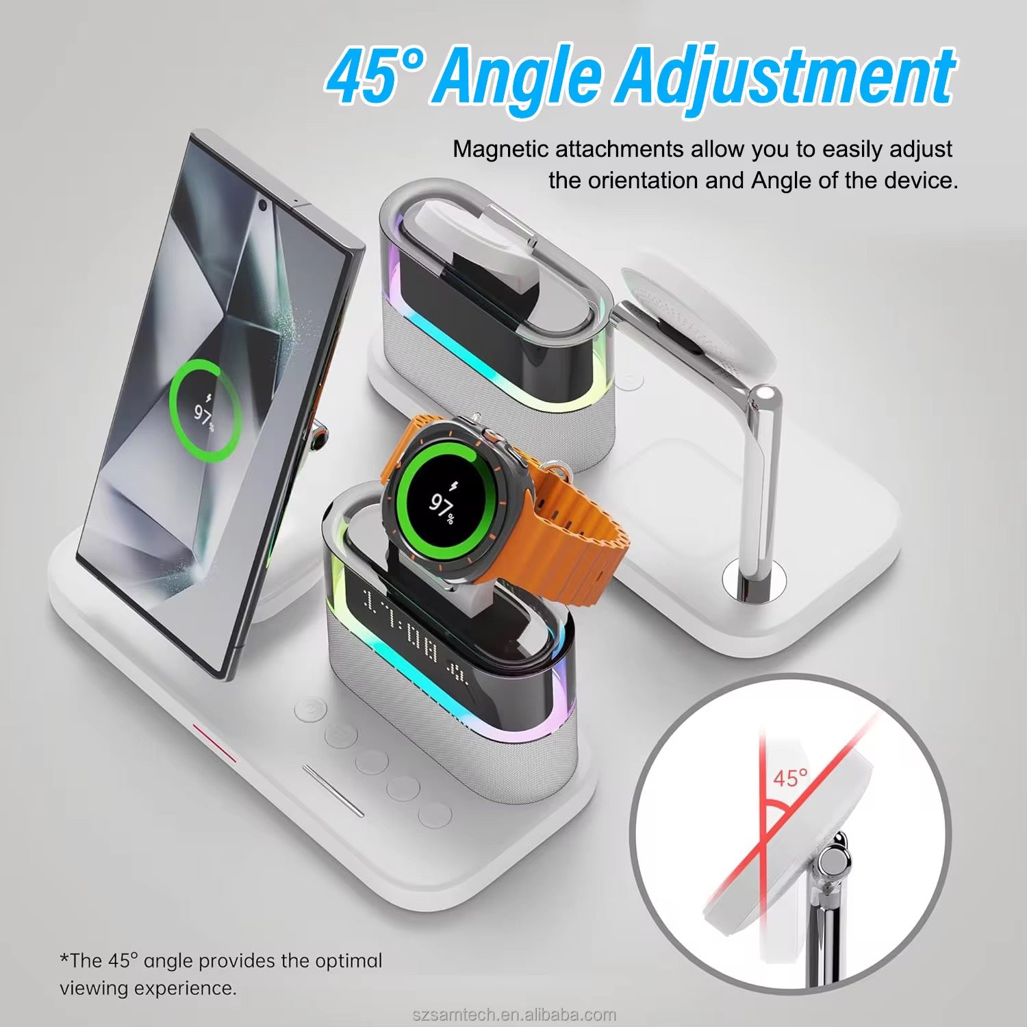 Cuenta con un soporte magnético Qi2 ajustable para mantener tu iPhone en posición vertical u horizontal mientras se carga de forma estable y rápida. En la parte superior integra una base dedicada para Apple Watch, permitiendo cargarlo de manera cómoda. En la base plana incorpora una zona adicional de carga inalámbrica para AirPods u otros audífonos compatibles con Qi.