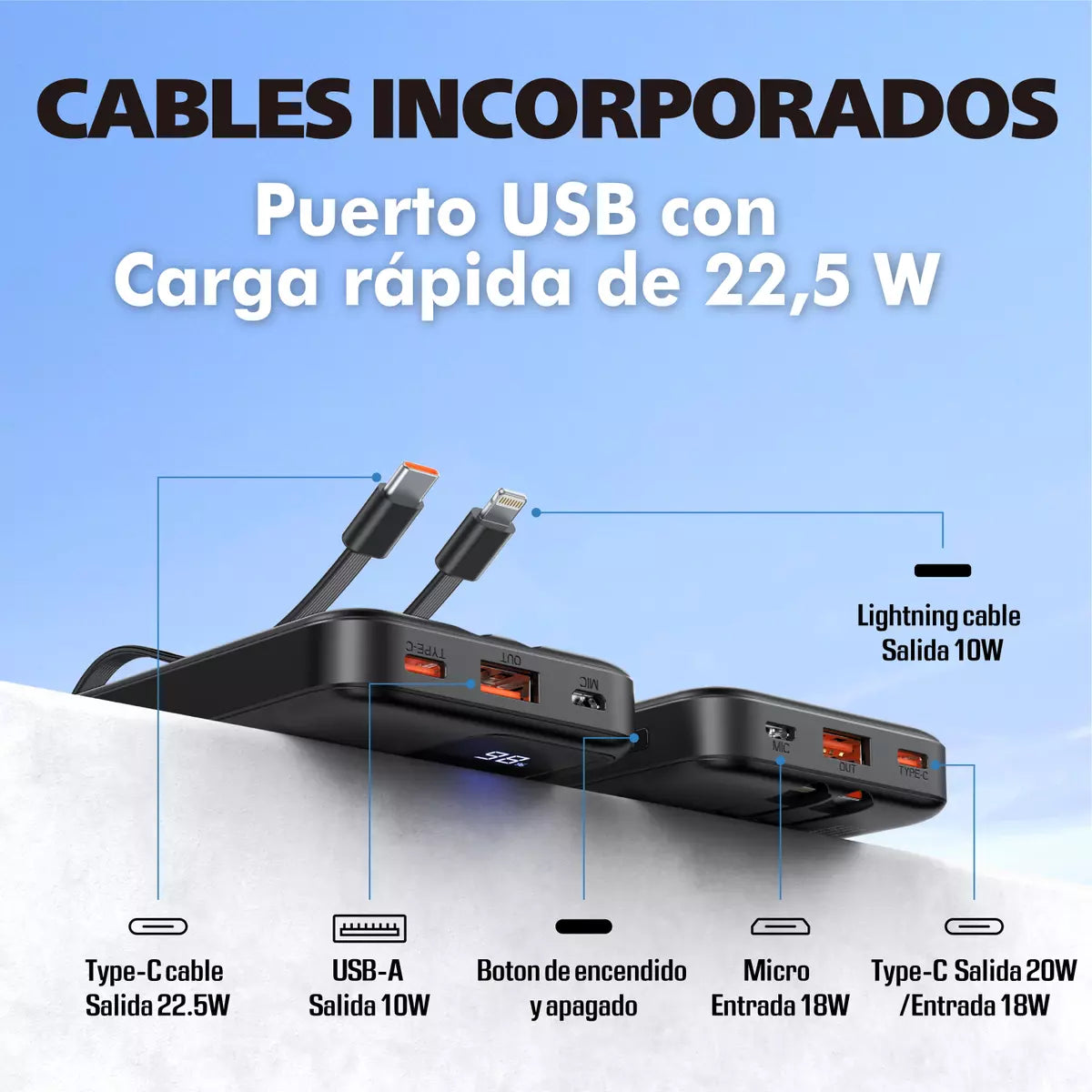 Cuenta con puertos USB Tipo-A, USB-C y Lightning, lo que la hace compatible con una gran variedad de dispositivos. Además, su indicador LED te permite saber cuánta carga queda en todo momento, para que no te quedes sin energía inesperadamente.